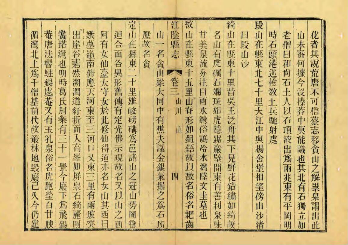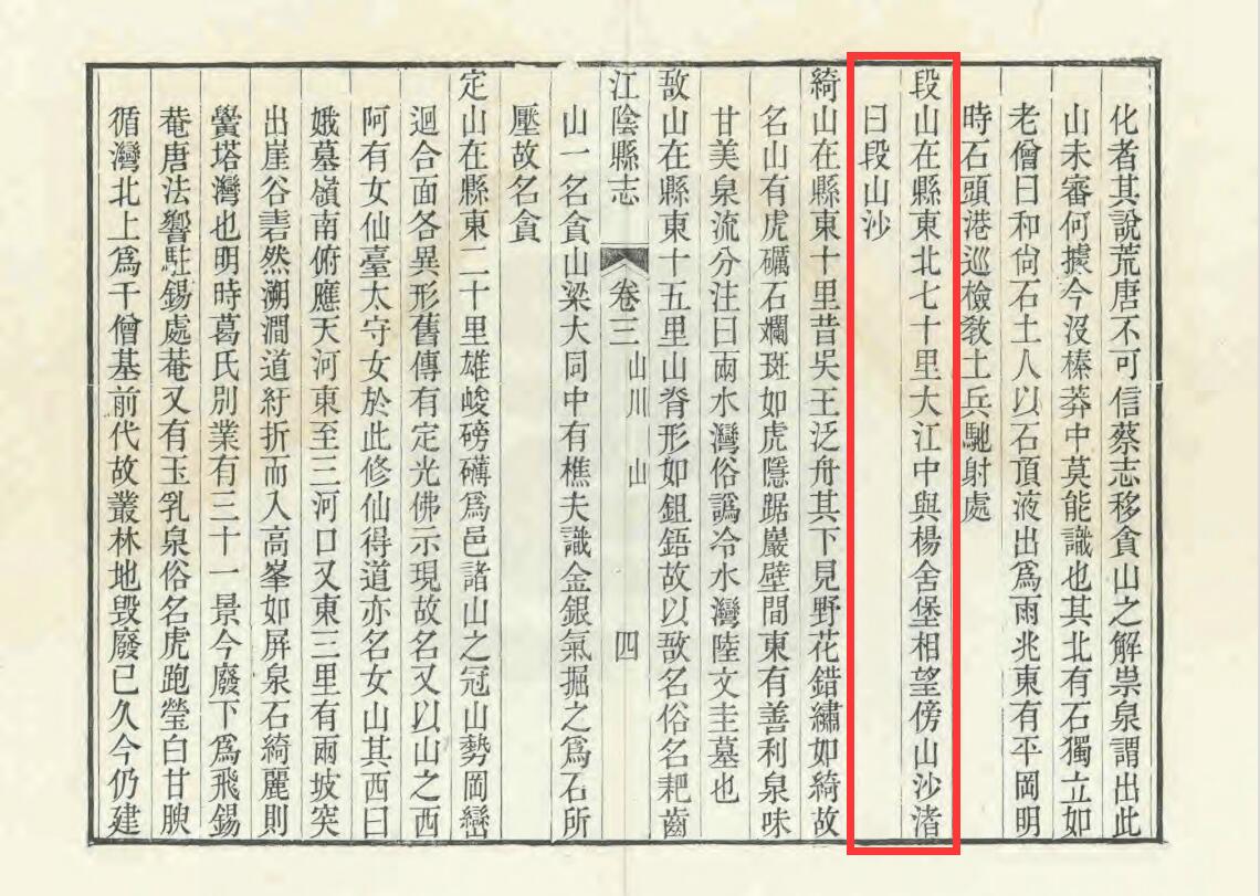 清道光20年[1840]-张延恩-《江阴县志》:段山在县东北七十里大江中,与杨舍堡相望,傍山沙渚曰段山沙。