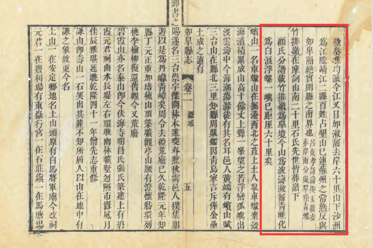 清乾隆《如皋县志》载:“邑之疆索赢于汉,缩于唐,画一于明,四至八到,固淮海名区也。白蒲以西,车马湖以东,波臣载吐载啮,昔人表摩诃山以正南界,而丰利、掘港、马塘三场则东境之环卫也。西鄙延陵,北鄙发扬。肇域最久,觉昔贤风期去人未远焉。”