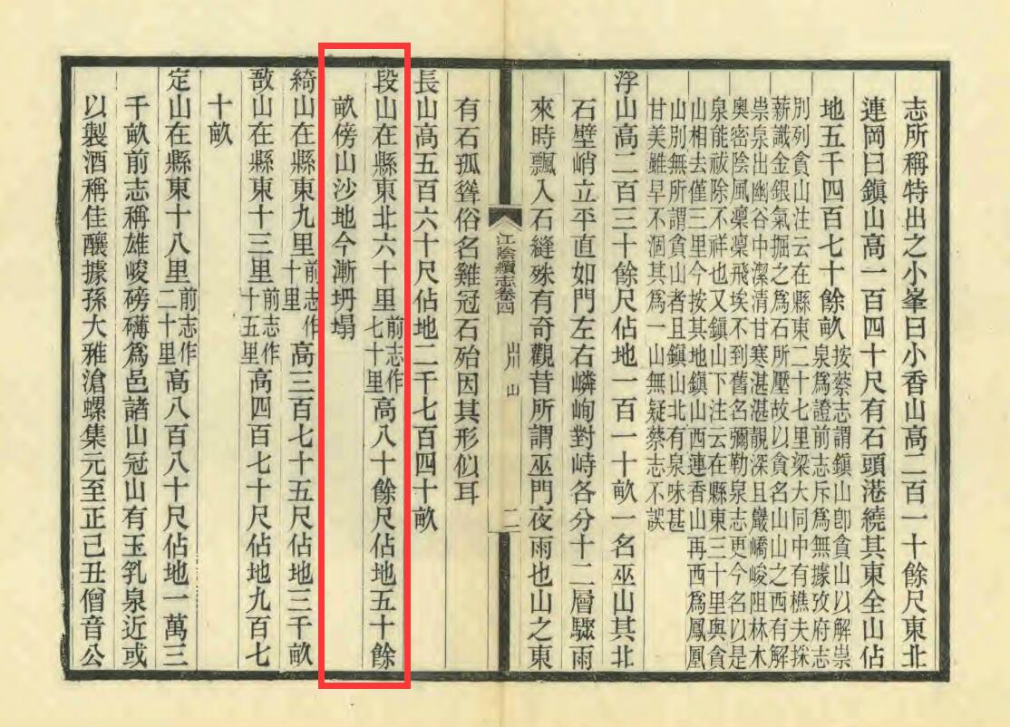 民國10年[1921]-陈思-《江陰縣續志》:段山在县东北六十里(小引:前志作七十里),高八十余尺,占地五十余亩,傍山沙地今渐坍塌。