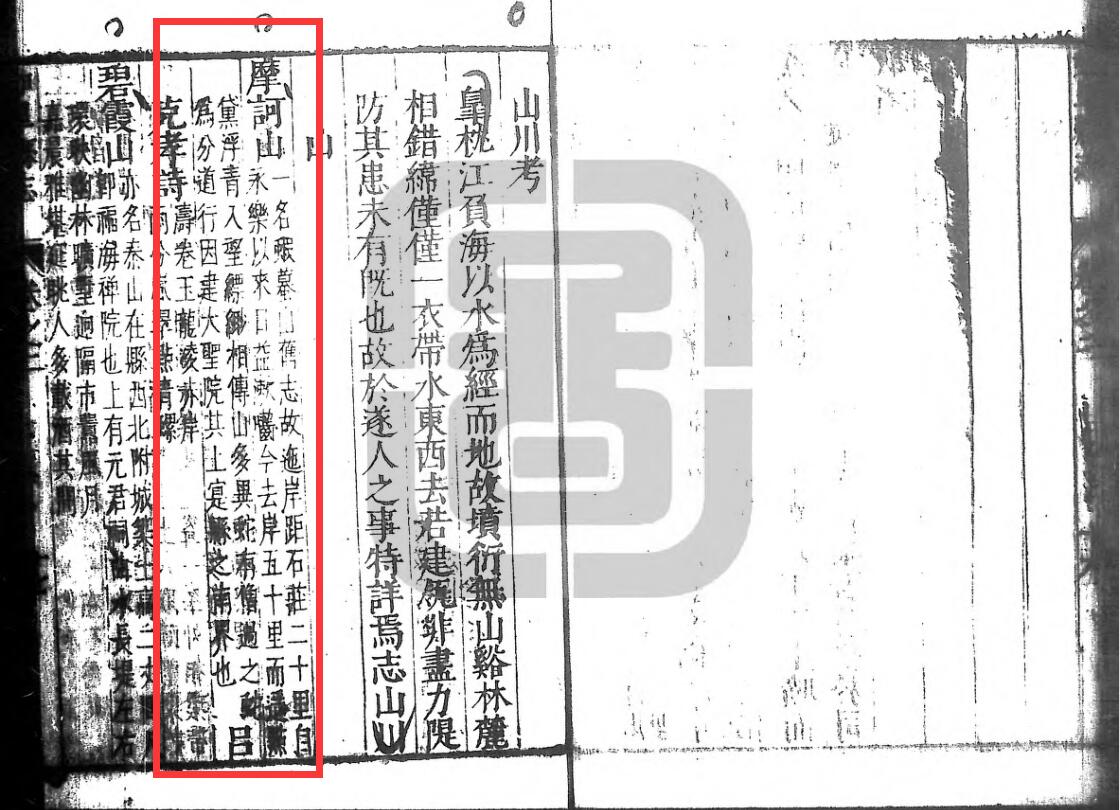 摩诃山:一名虾蟆山,旧志故迤岸距石庄二十里,自永乐以来,日益漱啮,今去岸五十里而遥。点青黛浮青入望缥缈,相传山多异蛇,有僧过之,蛇为分道行,因建大圣院其上,实县之南境也。吕克孝诗:“涛捲玉龙凌赤岸,两分岚翠点青螺”。